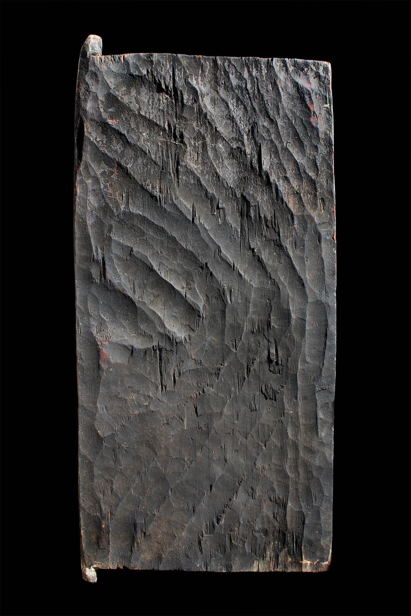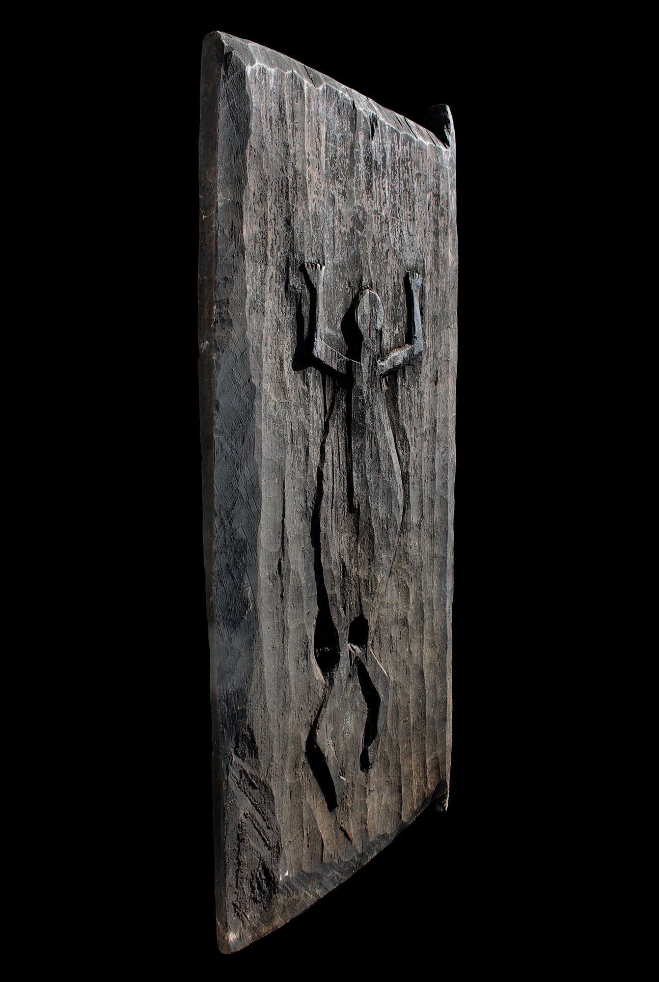 Heavy wood door from traditional house, with ancestral or simian spirit carved on the front.
