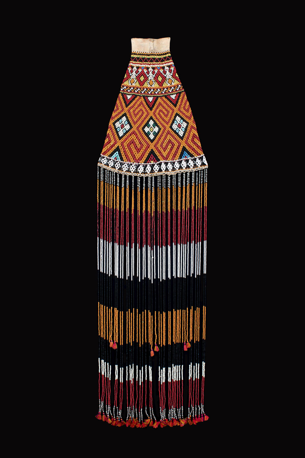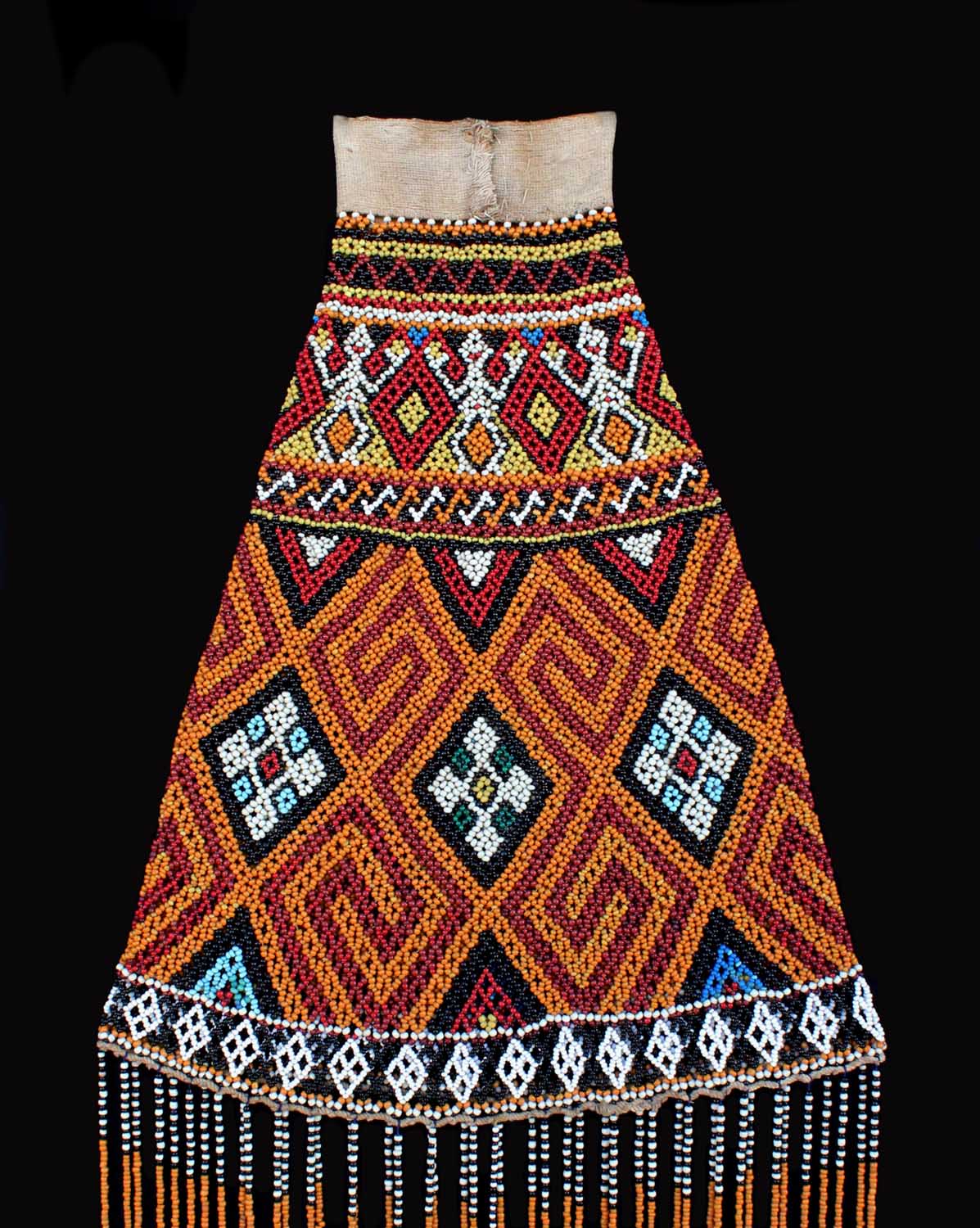 Glass seed beads, trade cloth. Full L: 49" (124.5 cm), w/o fringe L: 17" (43.2 cm), Flat W: 13" (33 cm). Early 20th century.