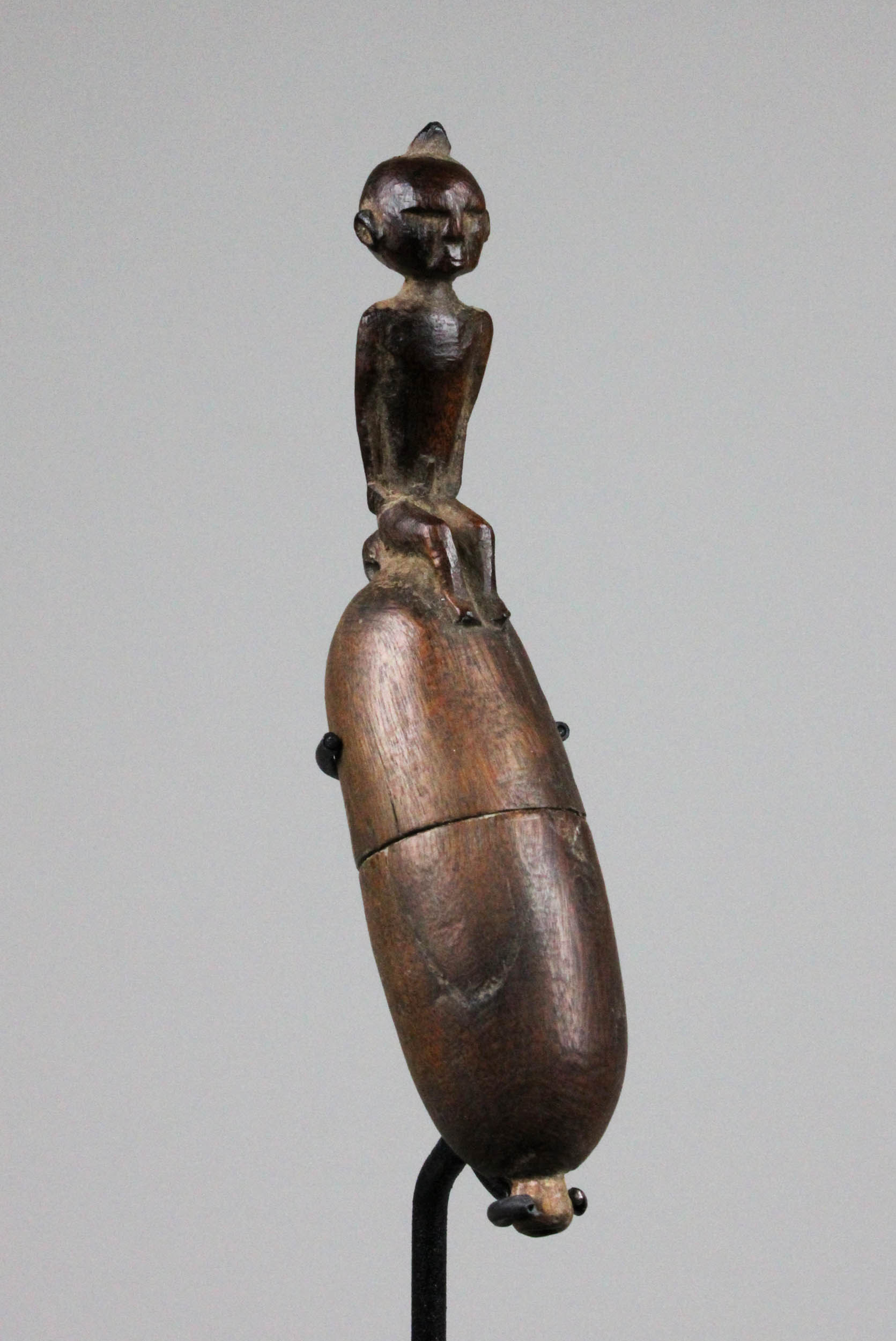 Unusual wood lime container (used for betel nut chewing) with sitting figure perched at top of lid.
