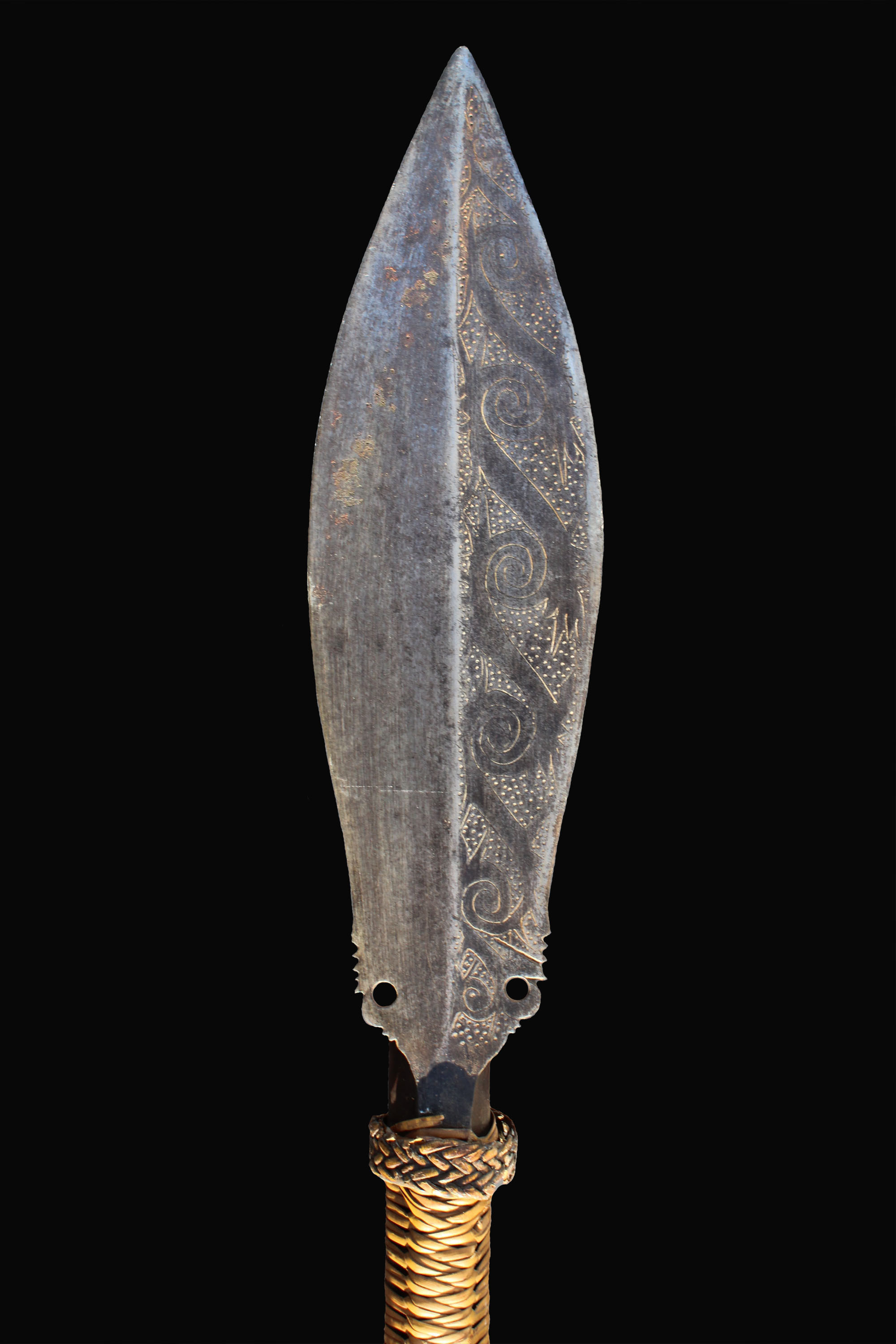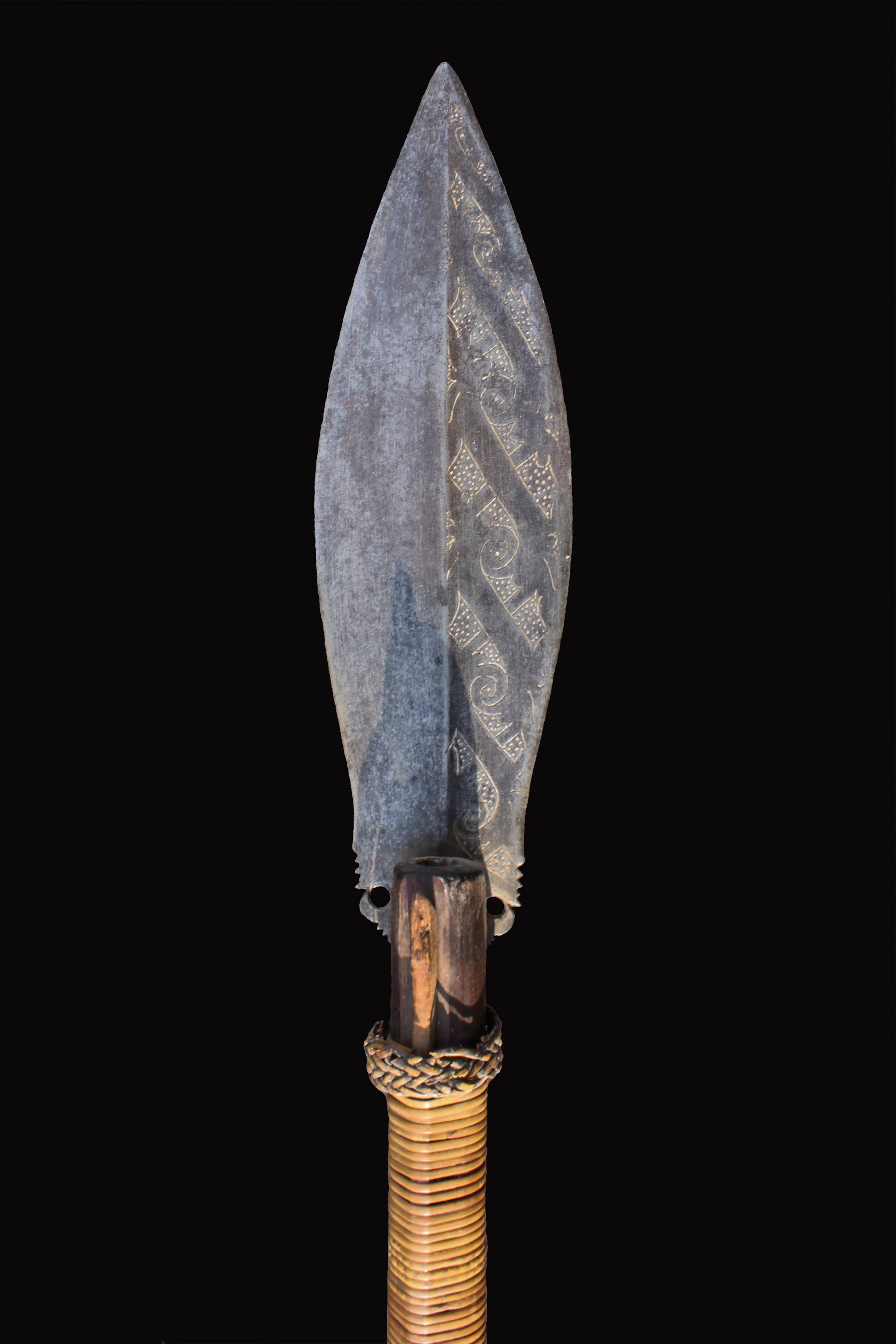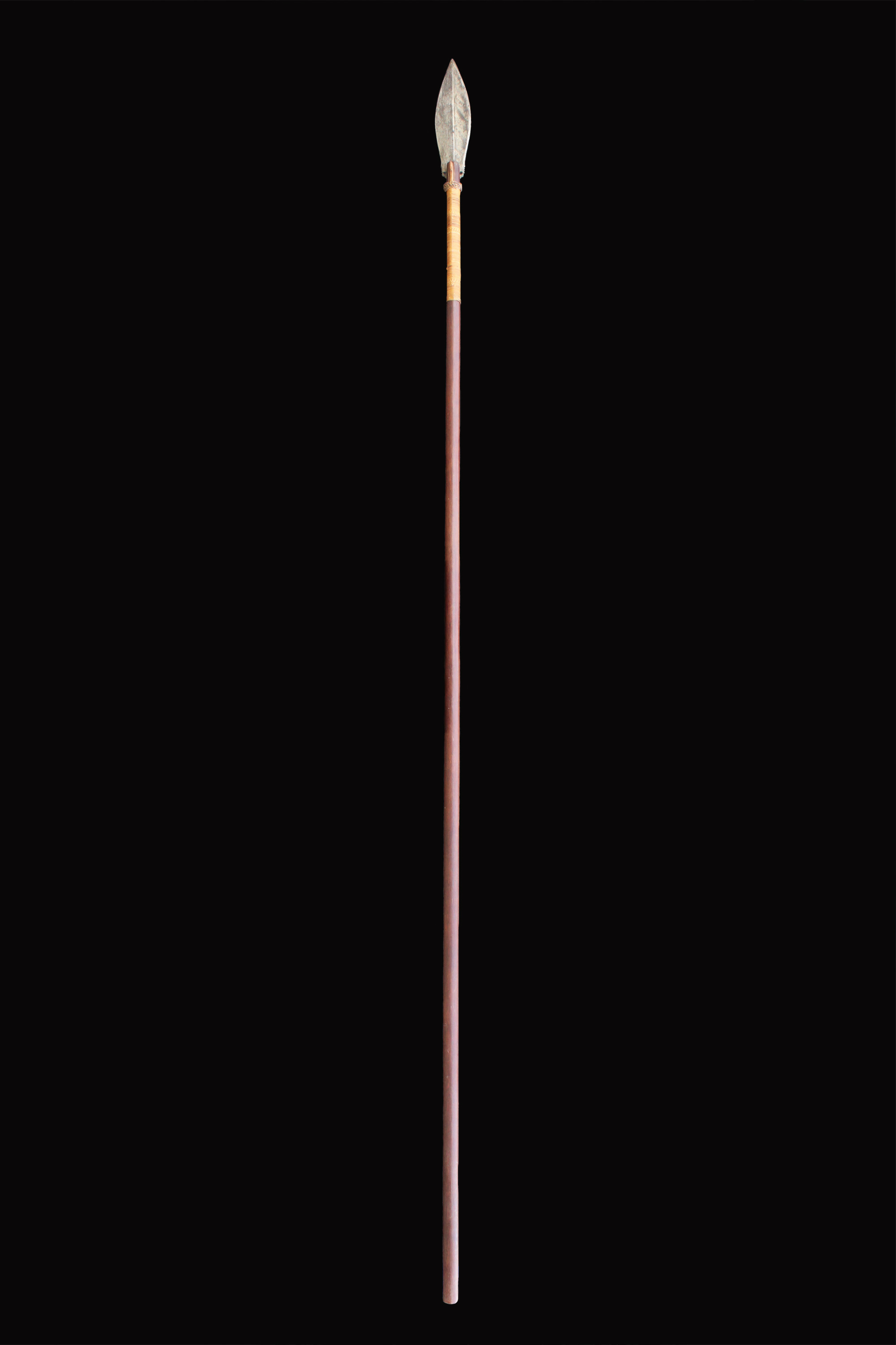 Rare longer blowgun with large spear blade attached to side of the shaft.
