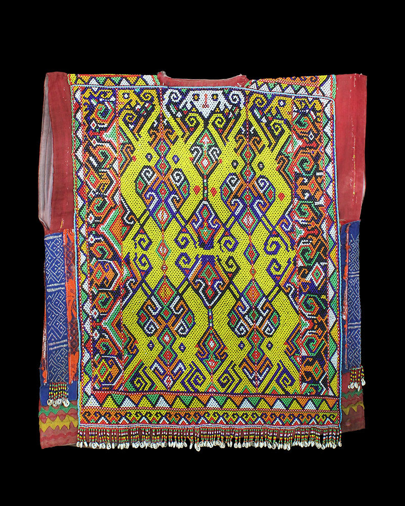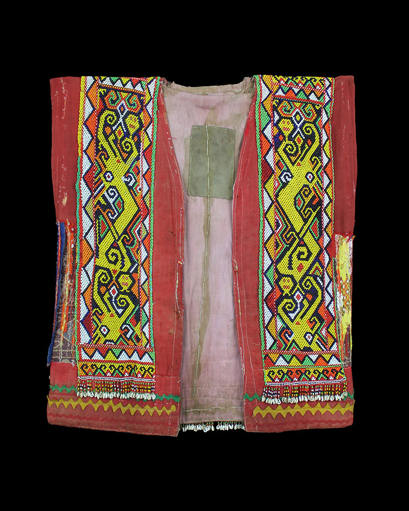 Woman's cerremonial jacket with beaded dragon or serpent motifs.