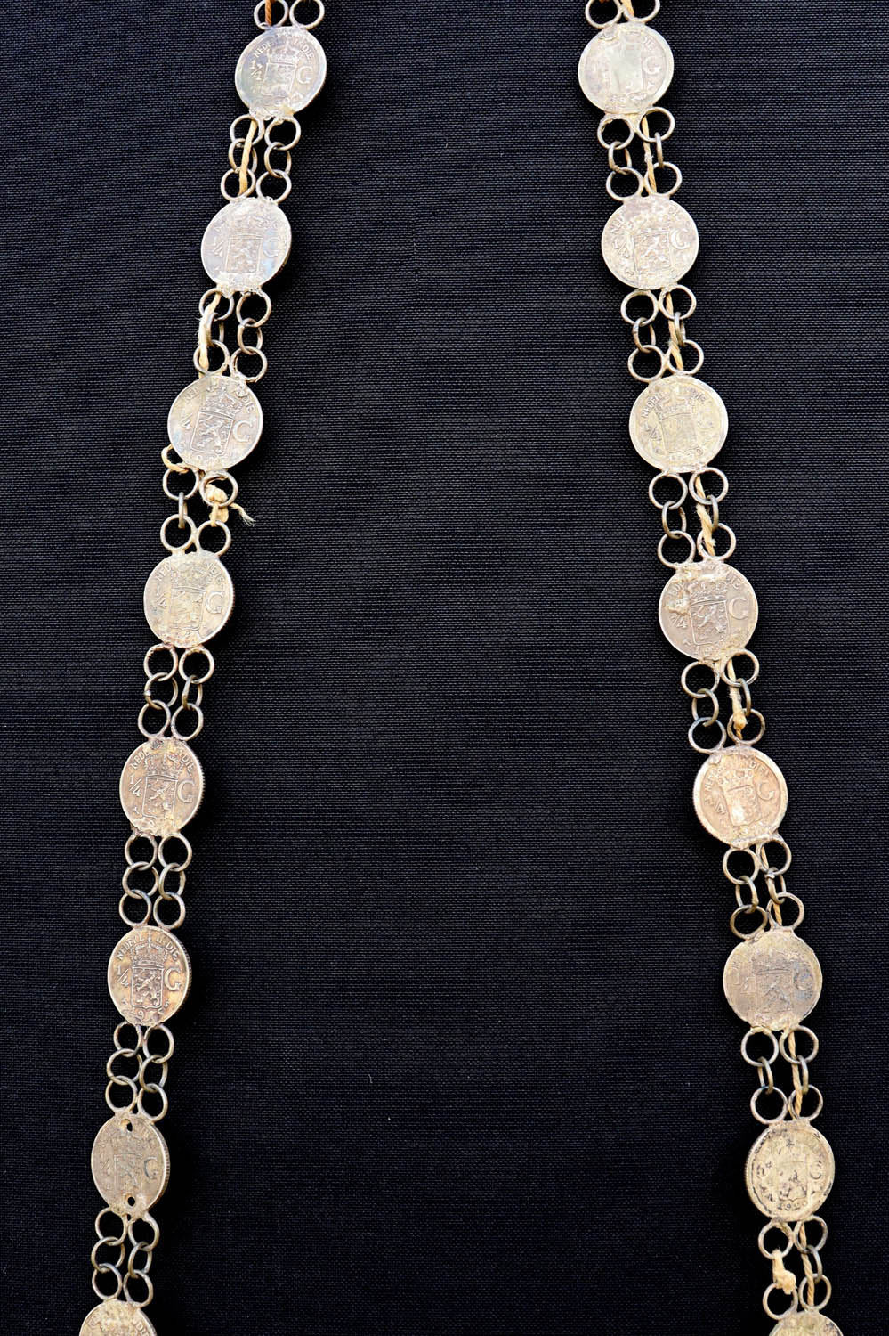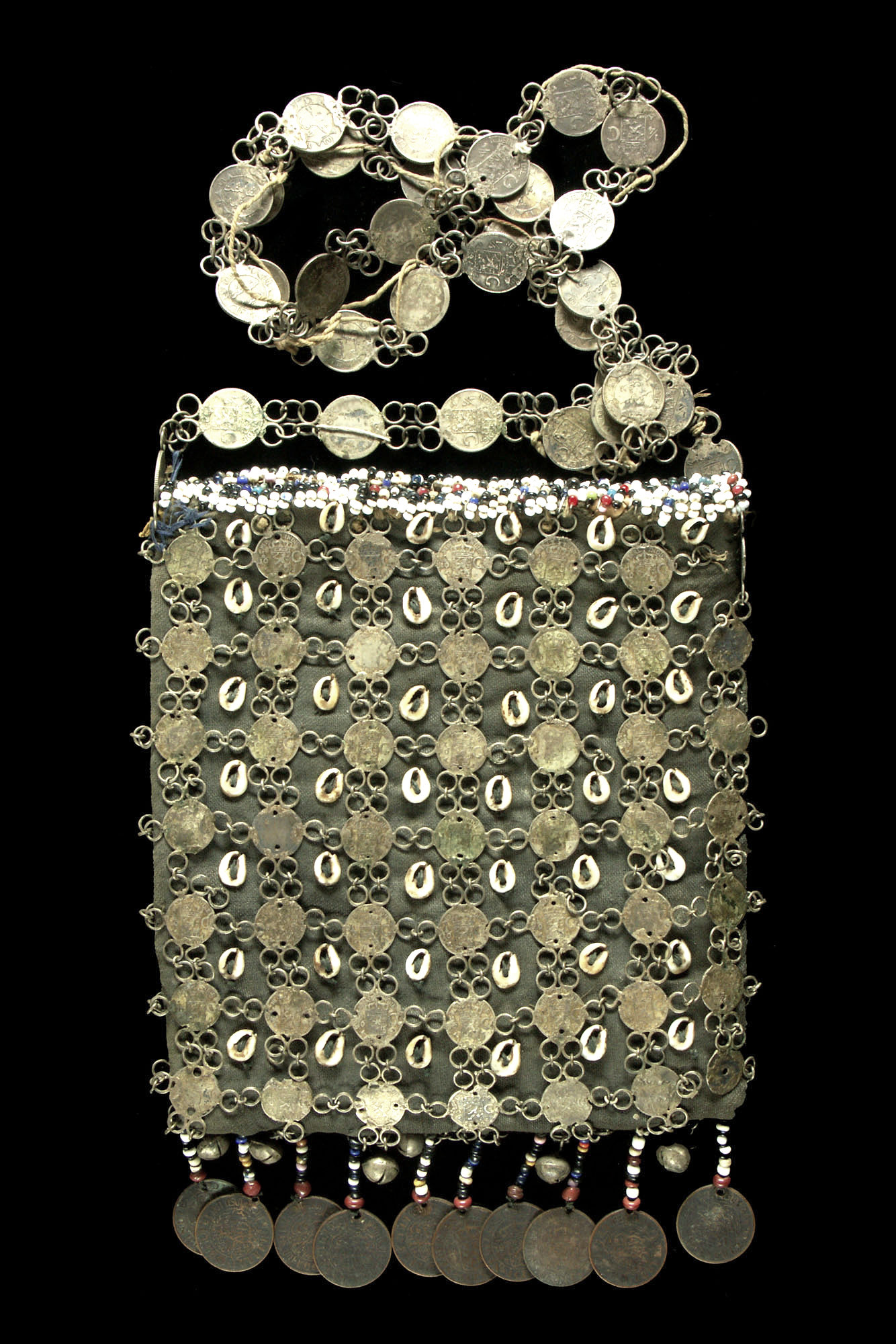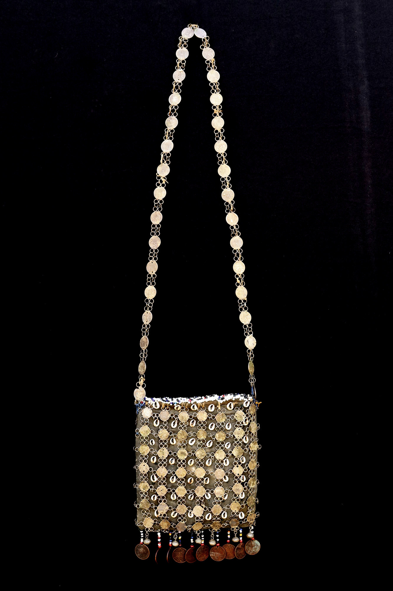 soldered together to form a frame into which the cloth bag is inserted. Other coins are used on the strap and as a decoration, sewn