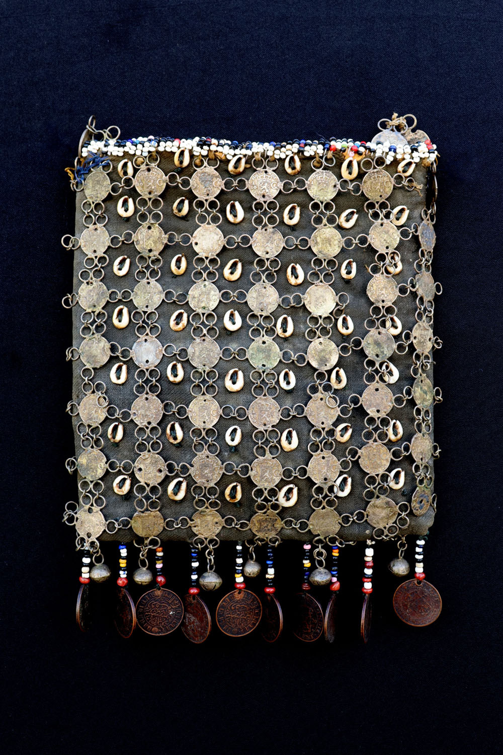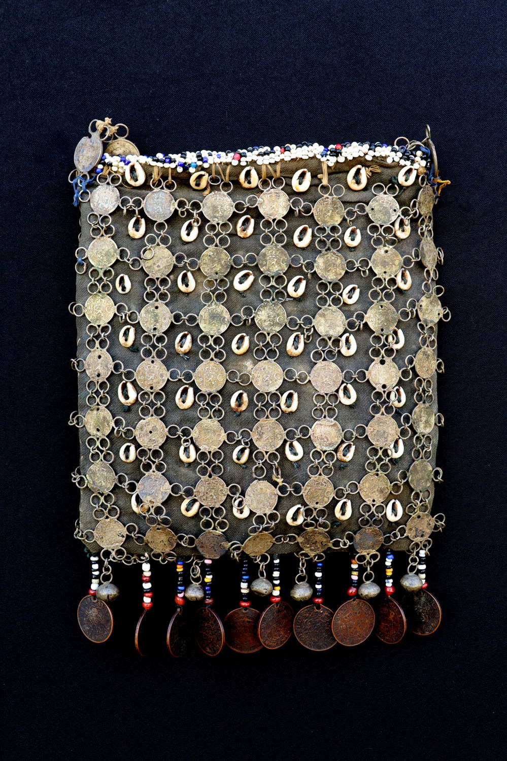 This bag is covered with an interlacing decoration of cowry shells (sewn directly into the cloth) and Dutch East Indies coins