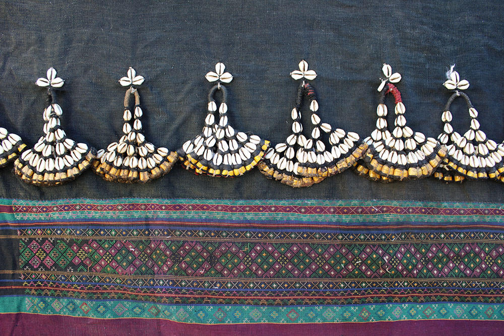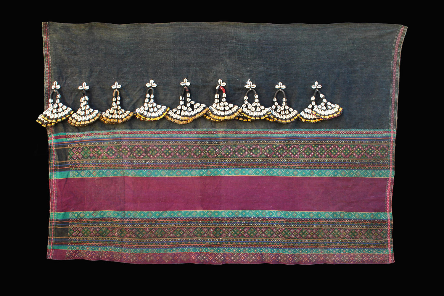 Cotton cloth with supplementary motifs and cowry shell dangles.