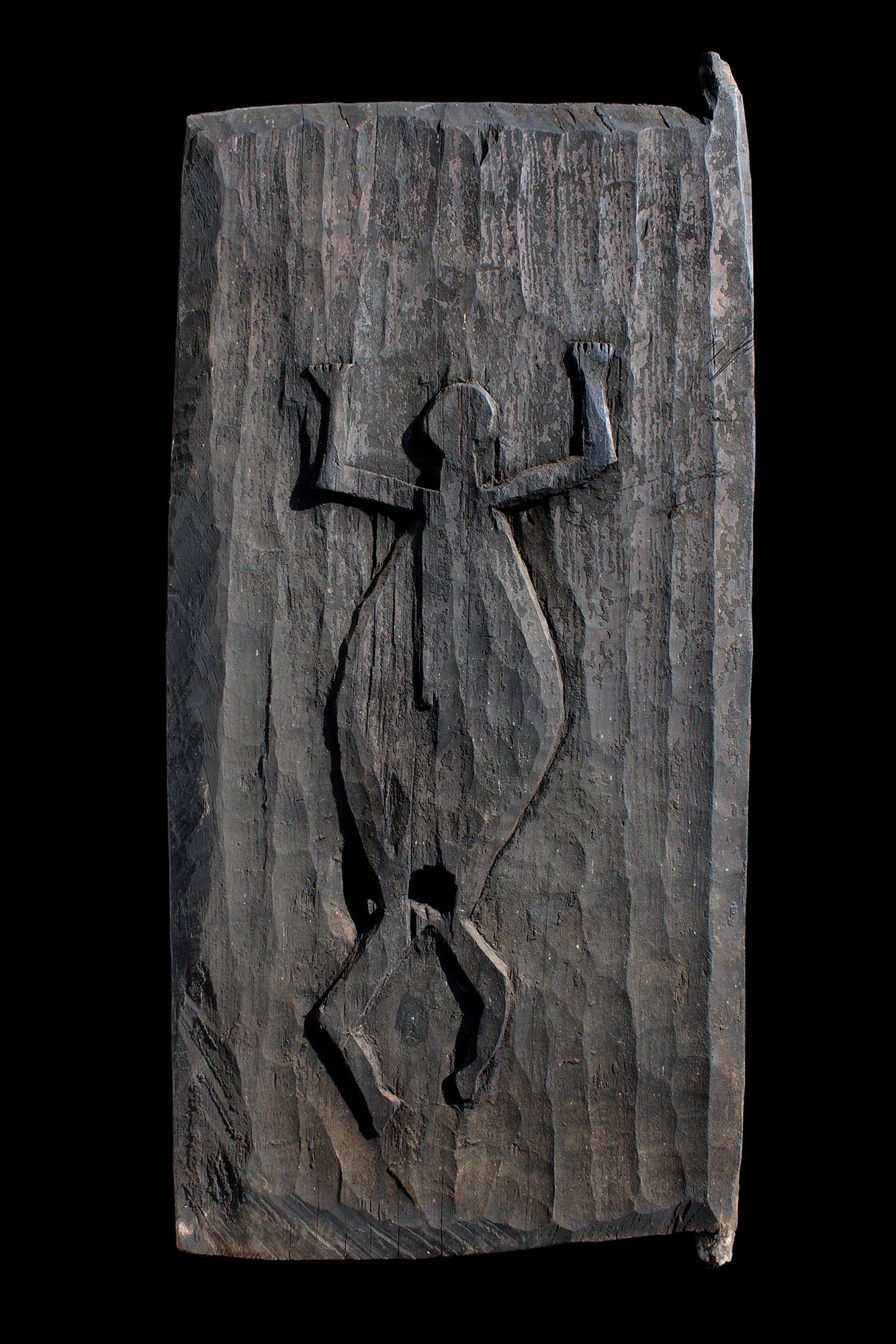 Heavy wood door from traditional house, with ancestral or simian spirit carved on the front.