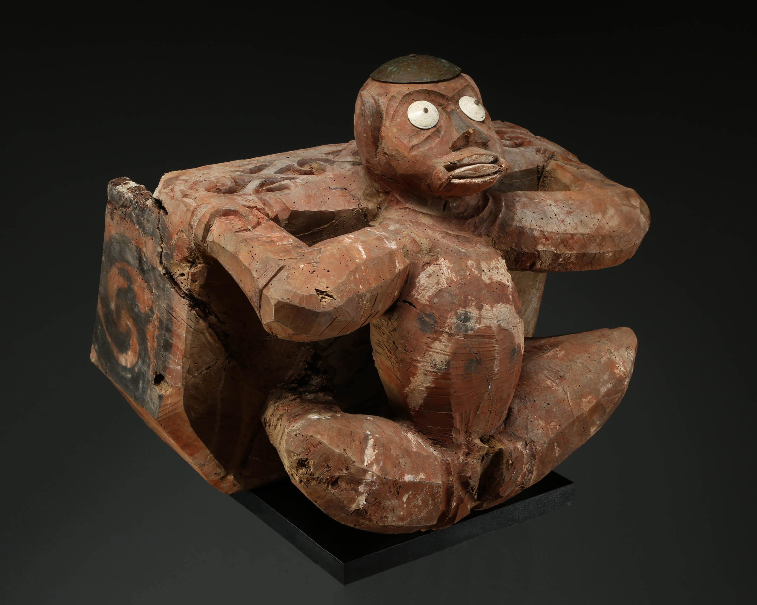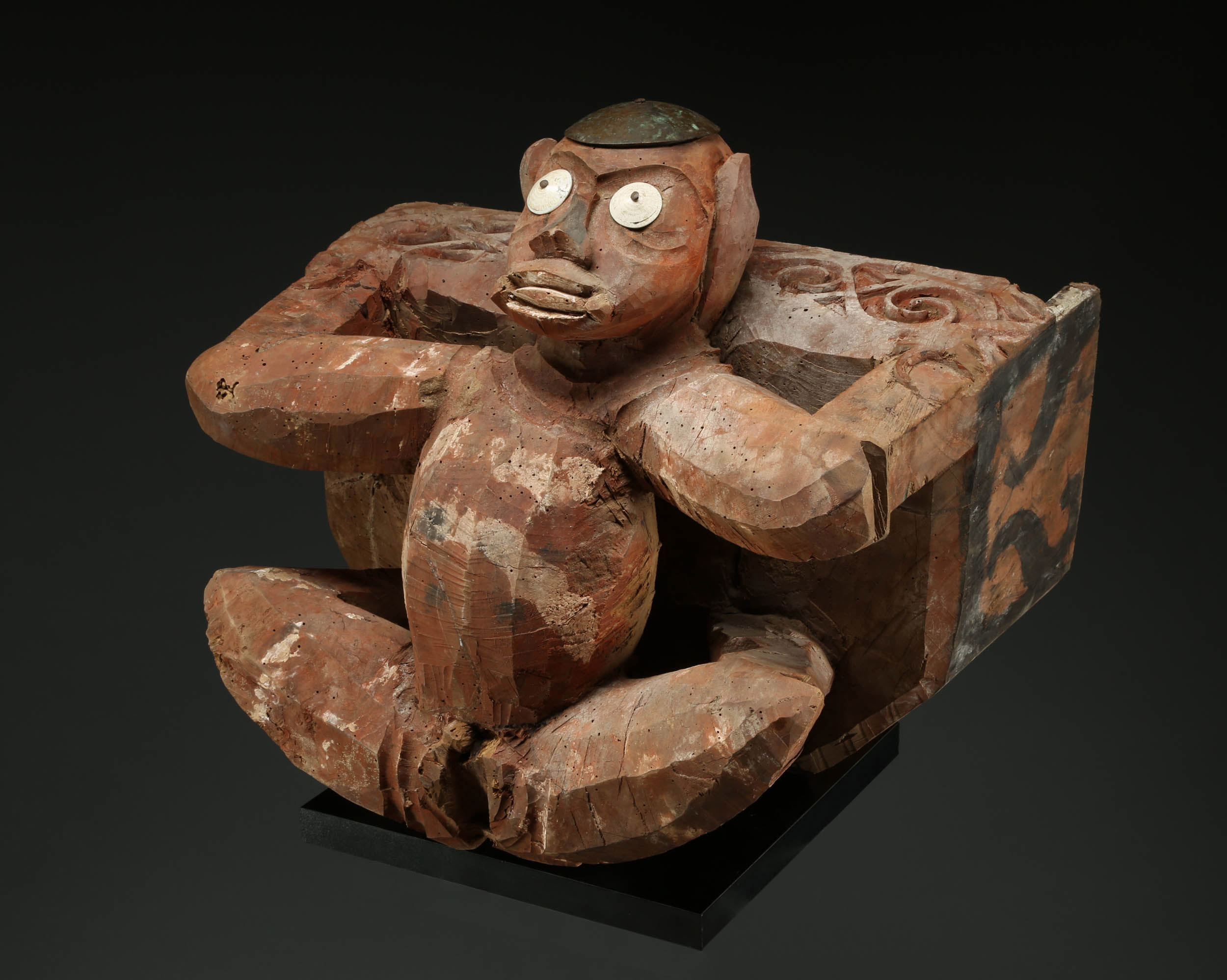 Shrine box guardian figure in the form of a simian or mythical creature.